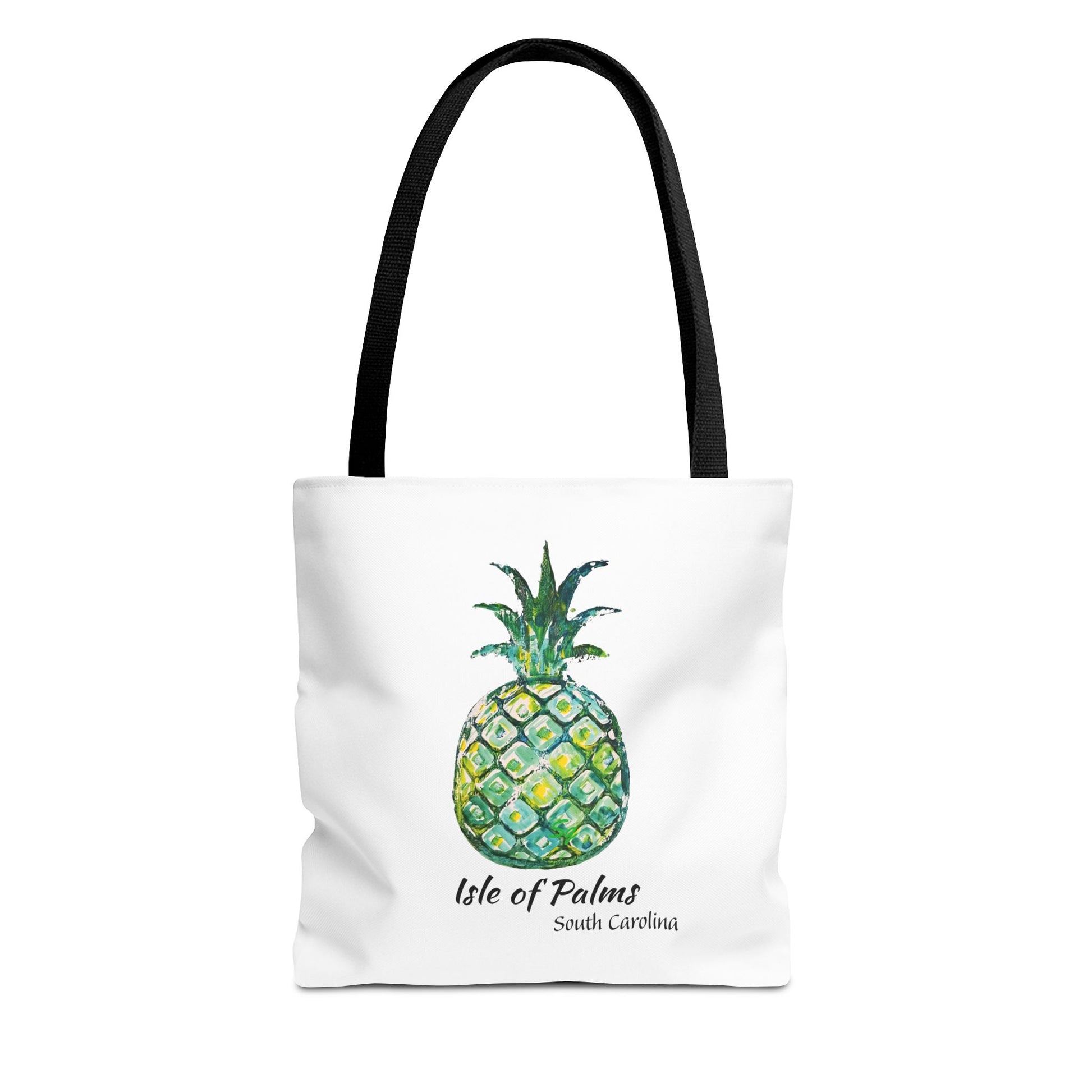 Brings seaside color to everyday errands with this original watercolor-pineapple art in sapphire and teal against crisp white fabric. It carries groceries, beach reads, or market finds, and the boxed-corner silhouette gives the bag roomy depth so your essentials sit neatly inside.